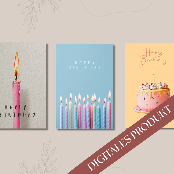 Unser „Birthday Candles“ Postkarten-Set enthält drei liebevoll gestaltete digitale Postkarten, die mit fröhlichen Kerzenmotiven jeden Geburtstag zum Leuchten bringen